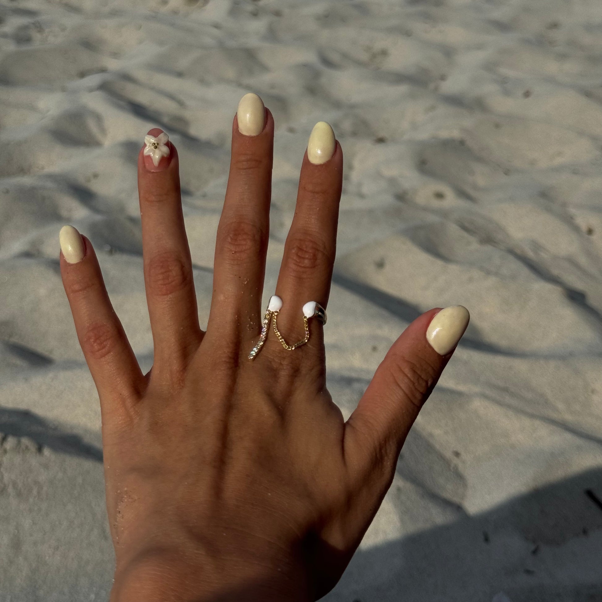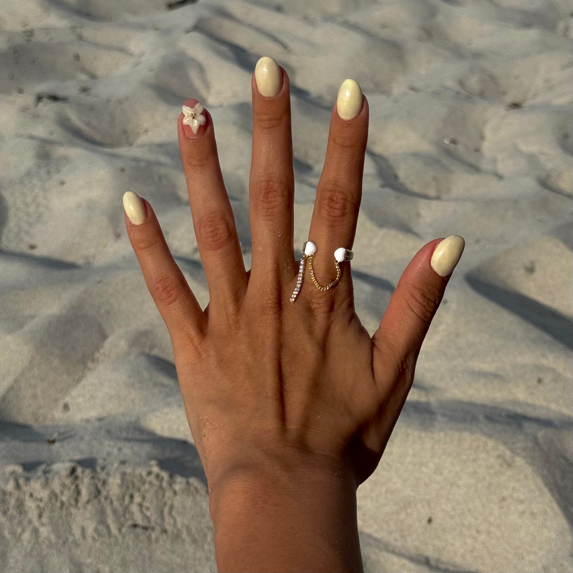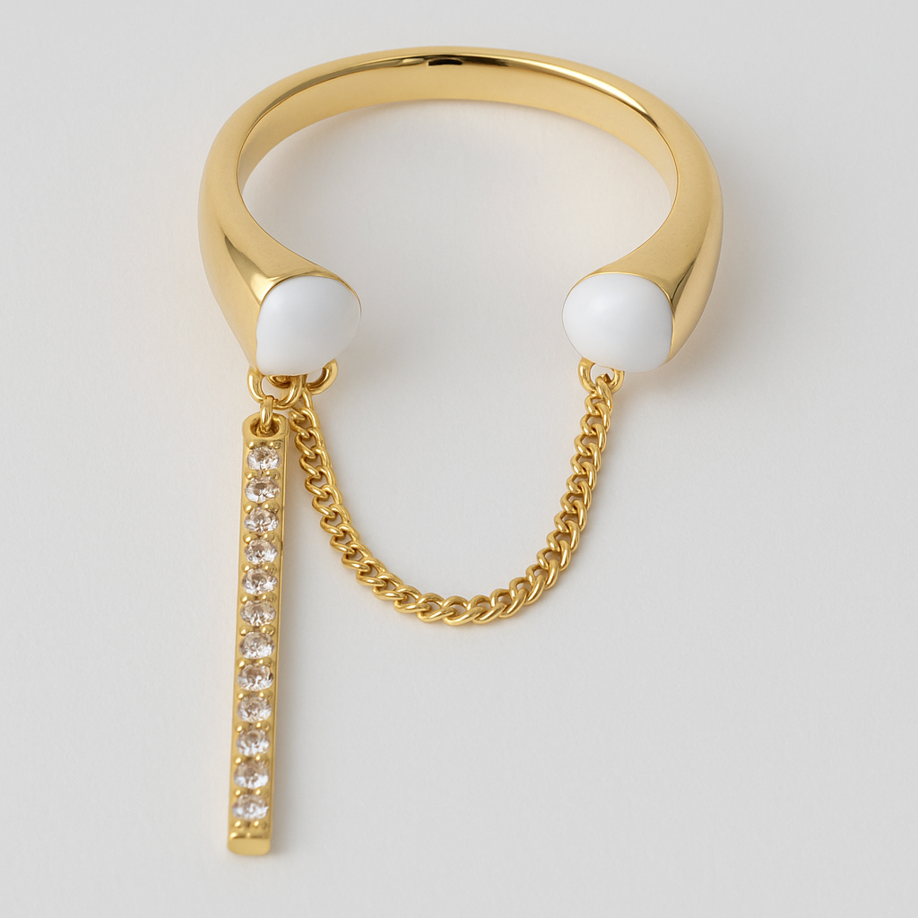 Este anillo abierto combina romanticismo y sofisticación en un diseño único. Los delicados corazones blancos se entrelazan con una cadena elegante y una barra de circonias que aporta brillo sutil, creando un accesorio que captura todas las miradas.