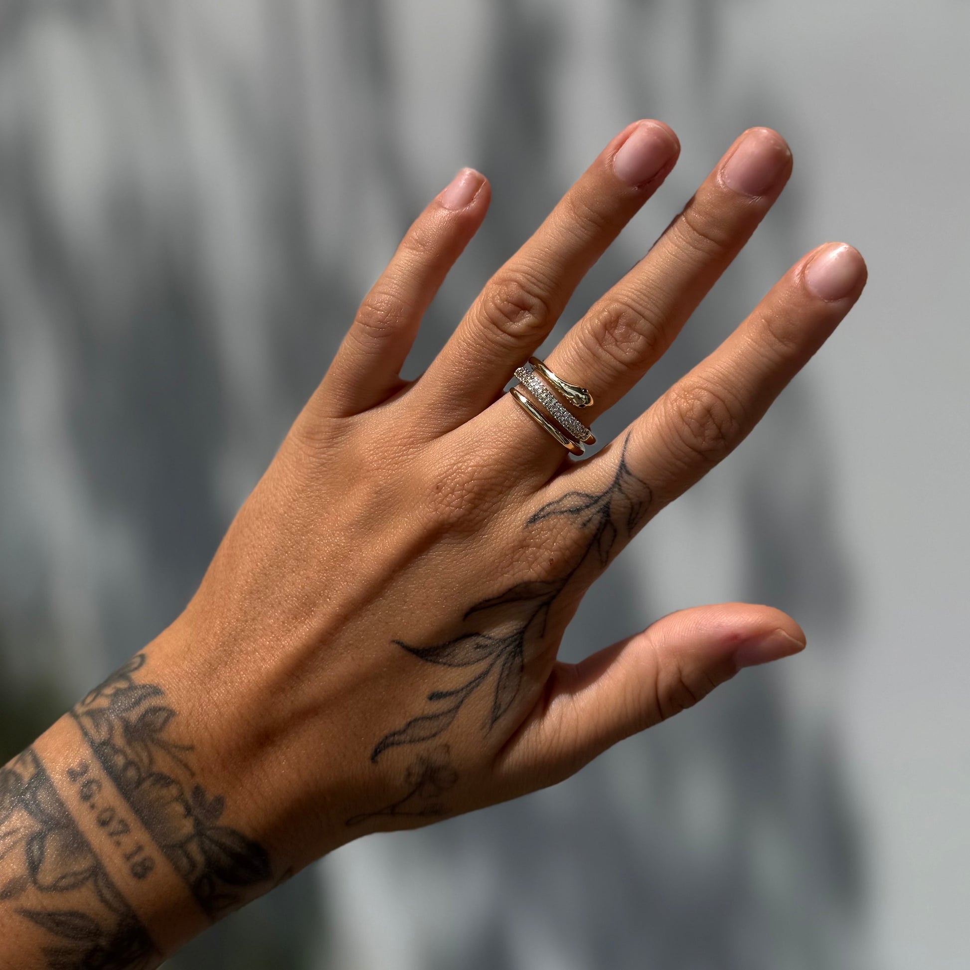 Este anillo ajustable con diseño de serpiente envuelve el dedo con un estilo audaz y enigmático. Su acabado detallado resalta las formas sinuosas del reptil, creando una pieza única que refleja poder, misterio y elegancia.