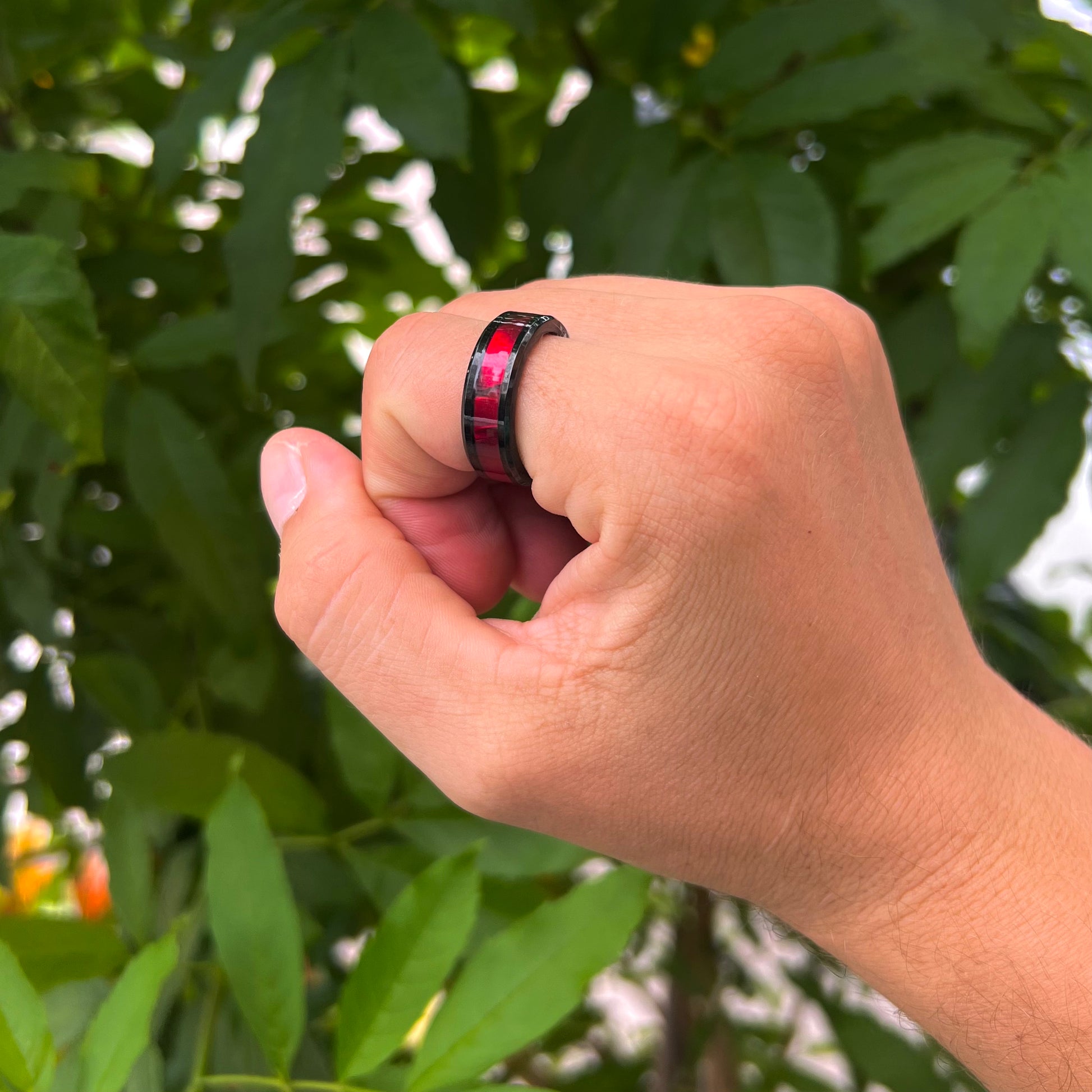 Este anillo tipo argolla en acero negro destaca por su diseño audaz, con una franja roja que recorre su circunferencia. Una pieza moderna y vibrante que combina fuerza, estilo y un toque de color distintivo.