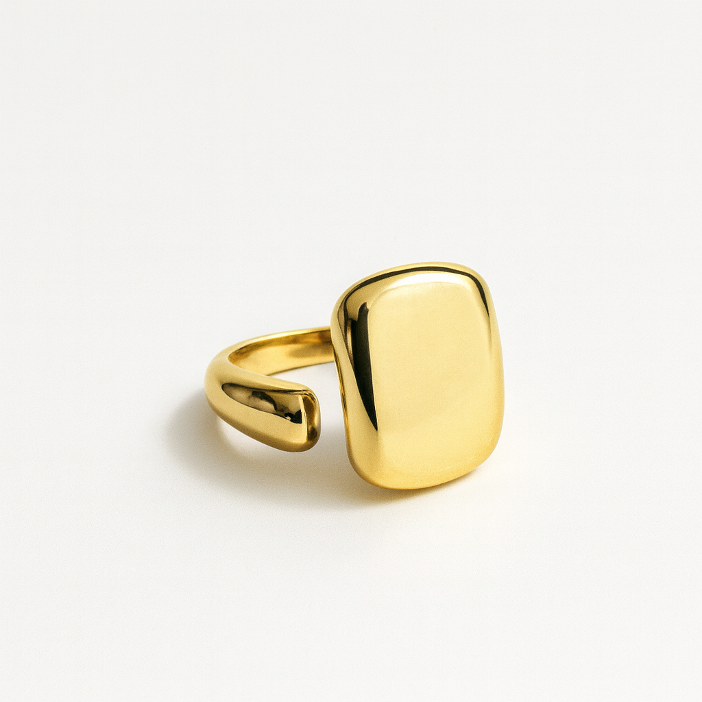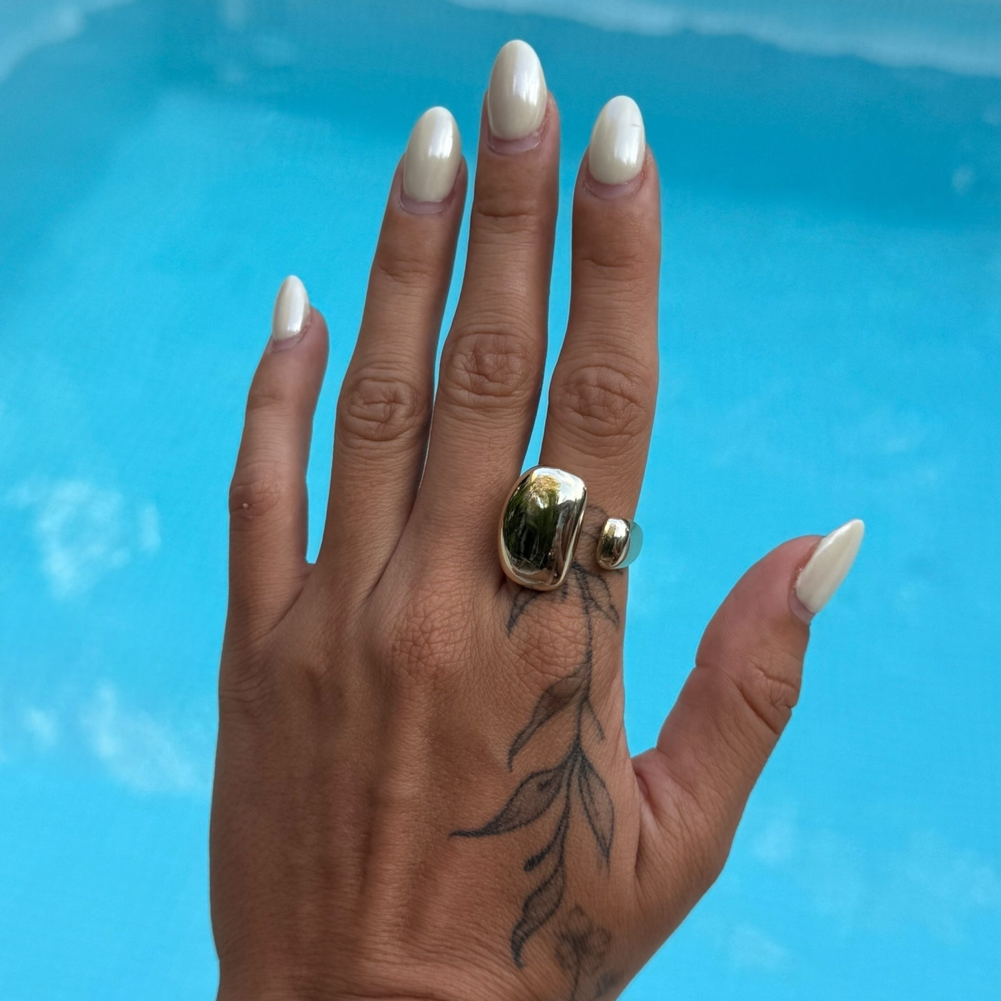 Llévalo como pieza protagonista o en combinación con anillos de líneas limpias para un look moderno y sofisticado.
