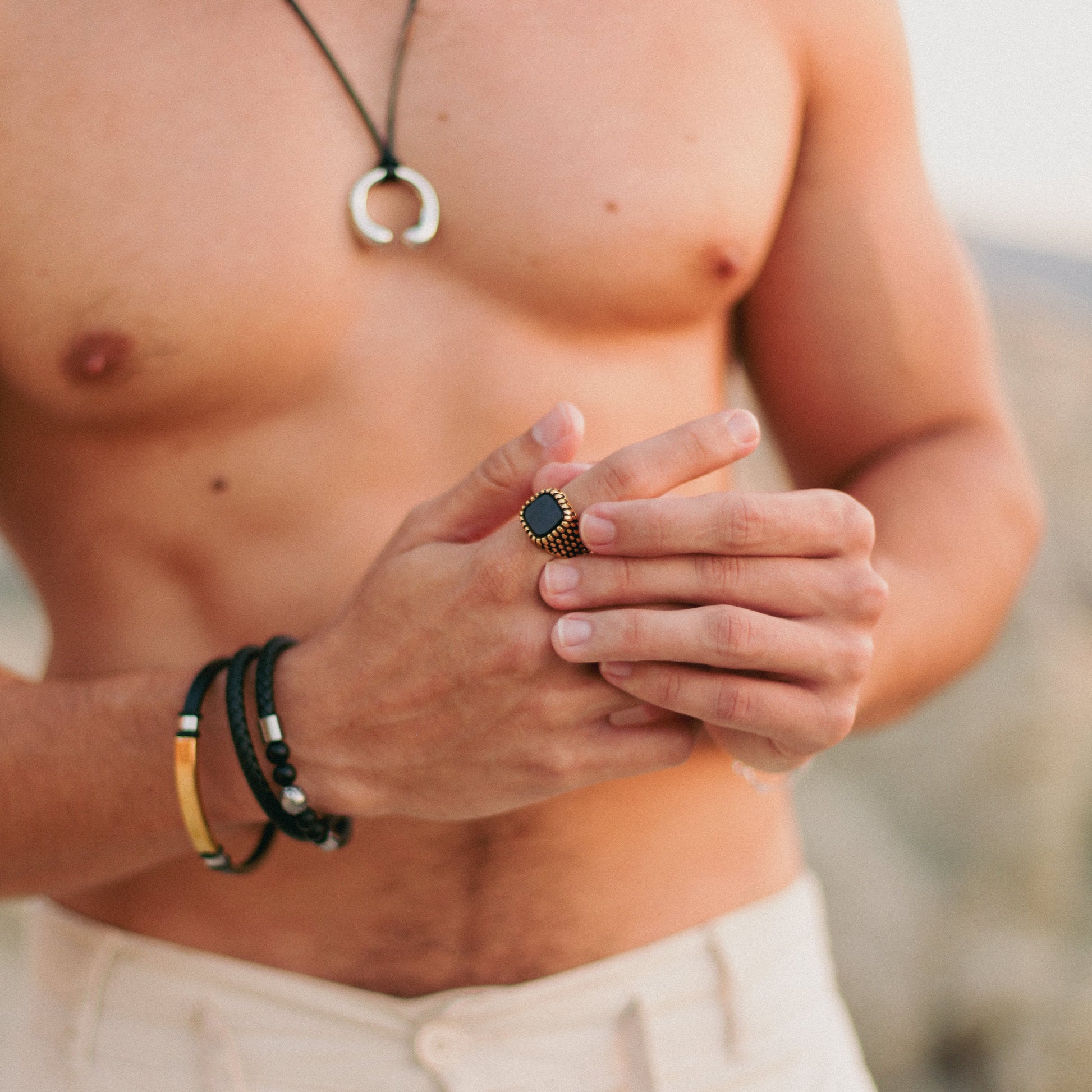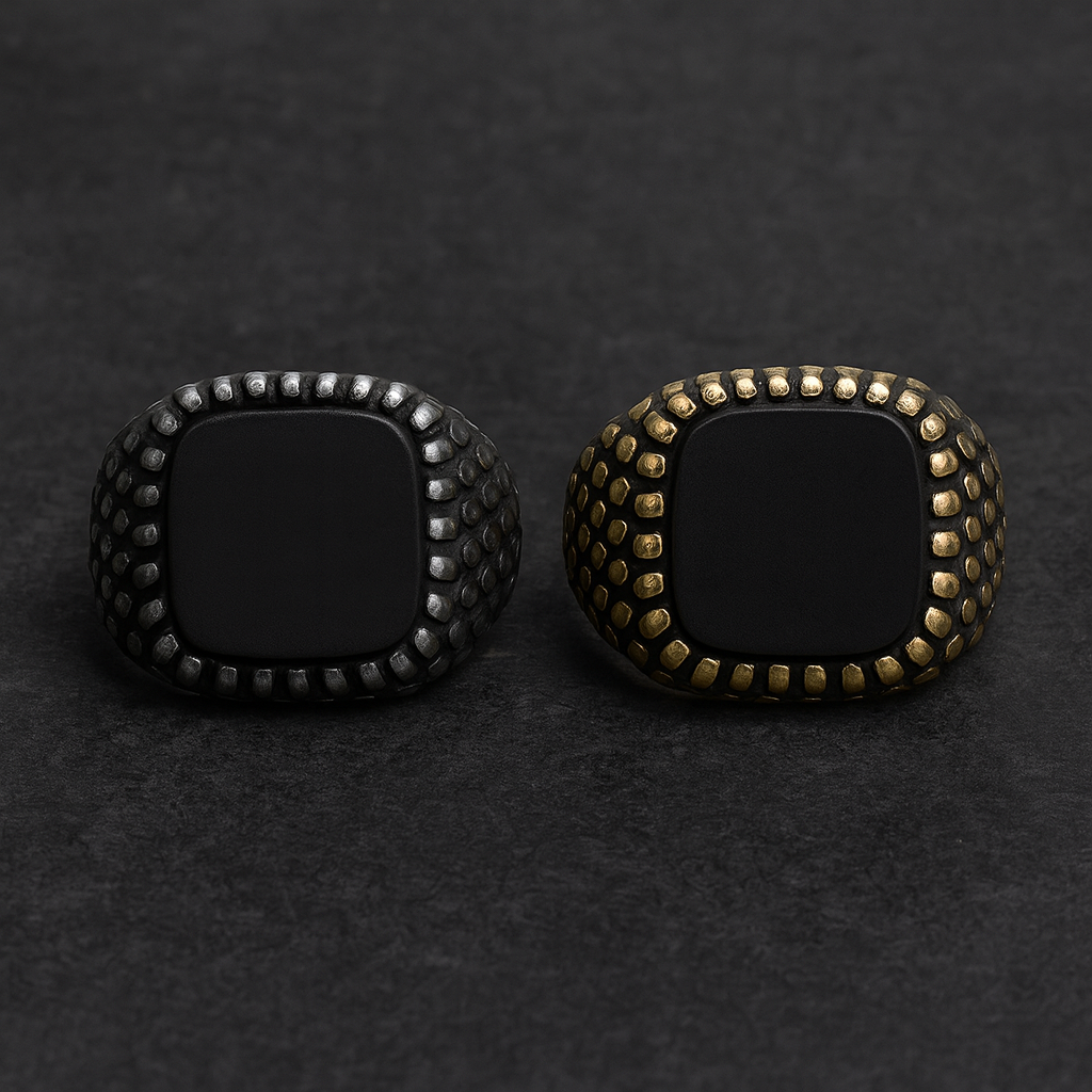 Este anillo de caballero destaca por su diseño audaz y sofisticado, con una piedra cuadrada central que aporta presencia y carácter. Los detalles de escamas que la rodean le añaden textura y estilo, creando una pieza única y estilizada.