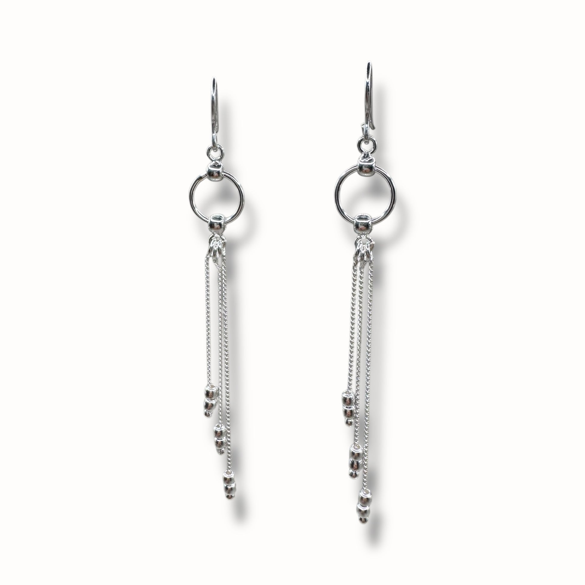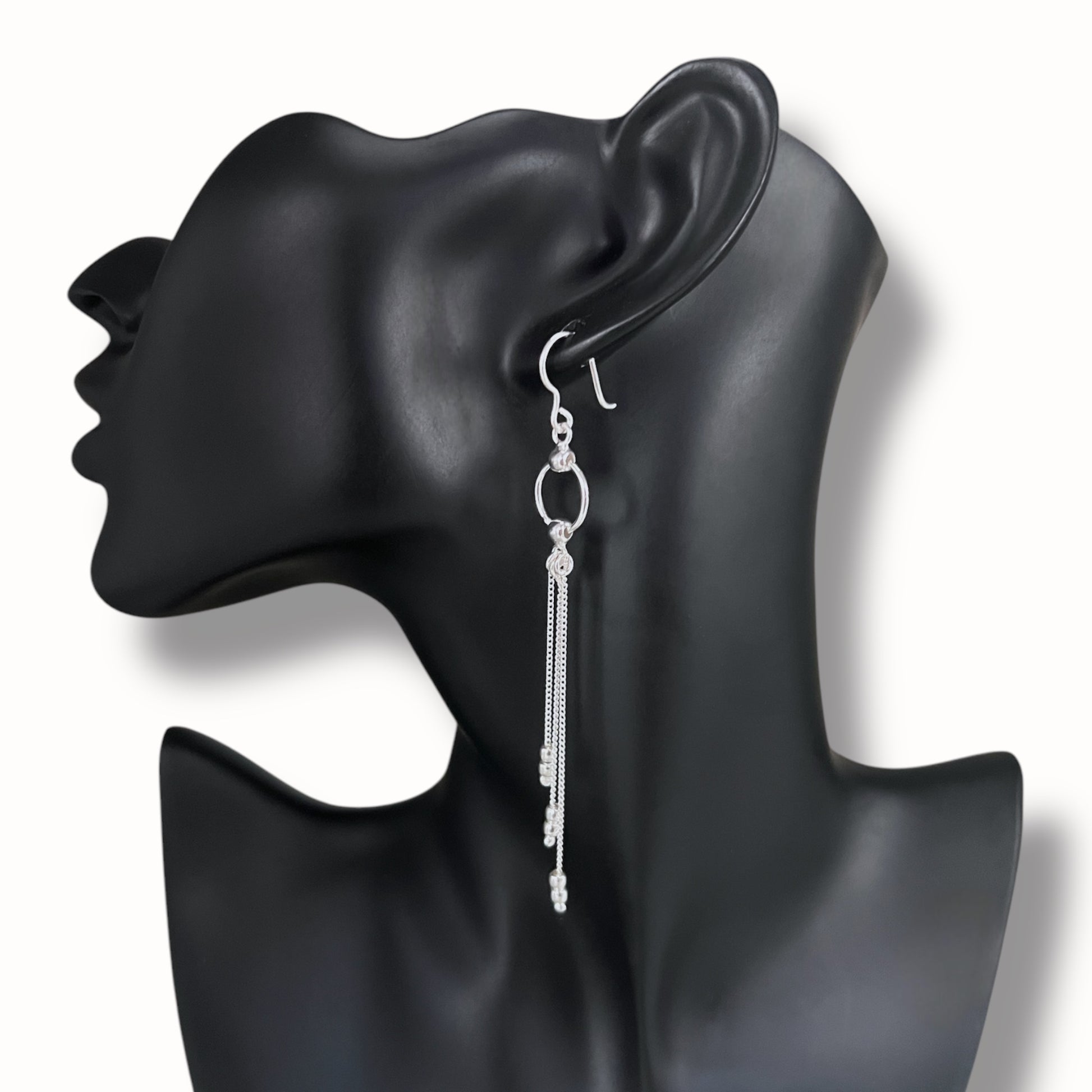 Aretes largos de plata con cadenas finas y esferas colgantes