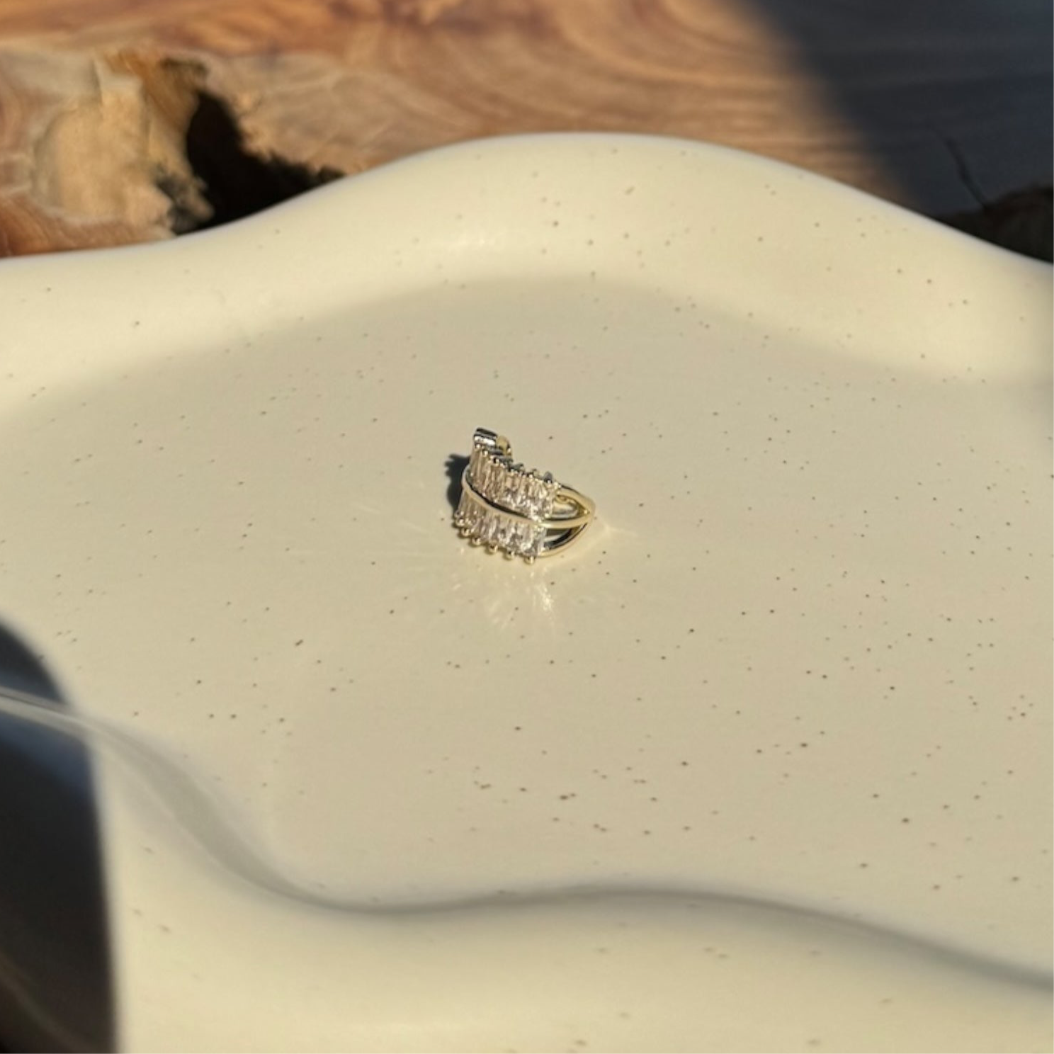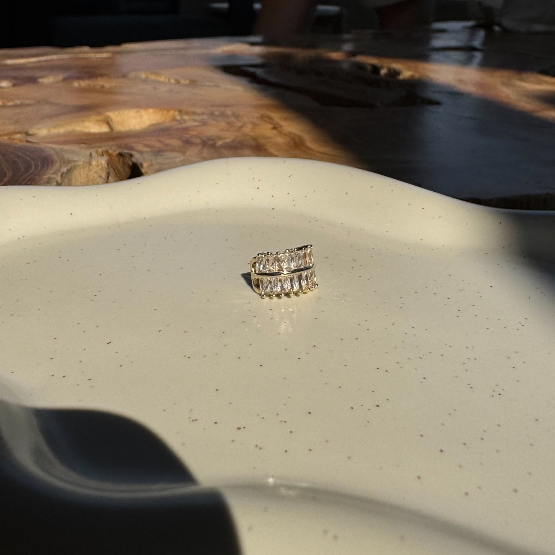 Una pieza elegante y sin perforación, compuesta por dos filas de circonias transparentes que aportan un brillo refinado y sofisticado. Diseñado para abrazar la oreja con estilo, es ideal para quienes buscan destacar con sutileza.