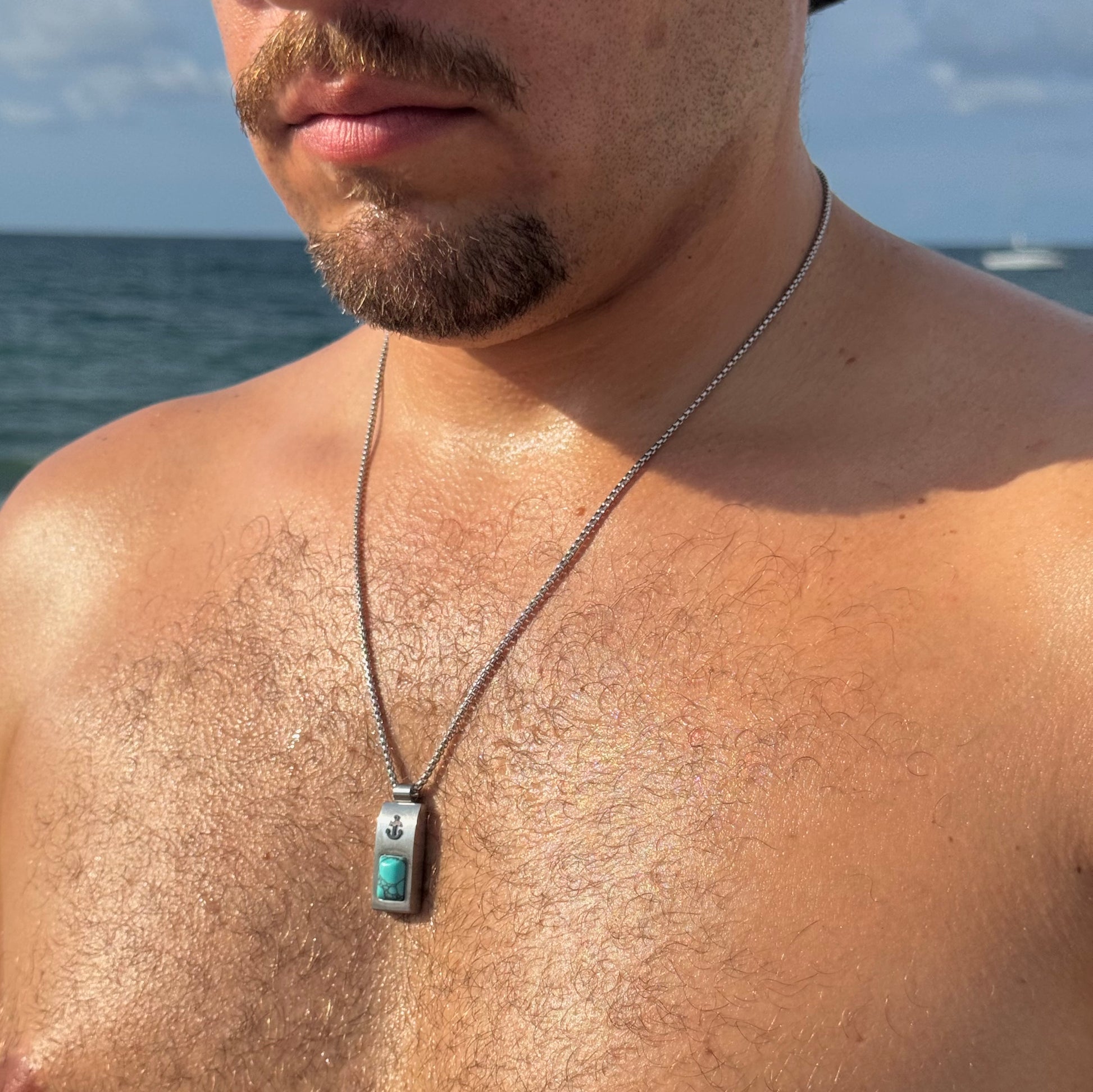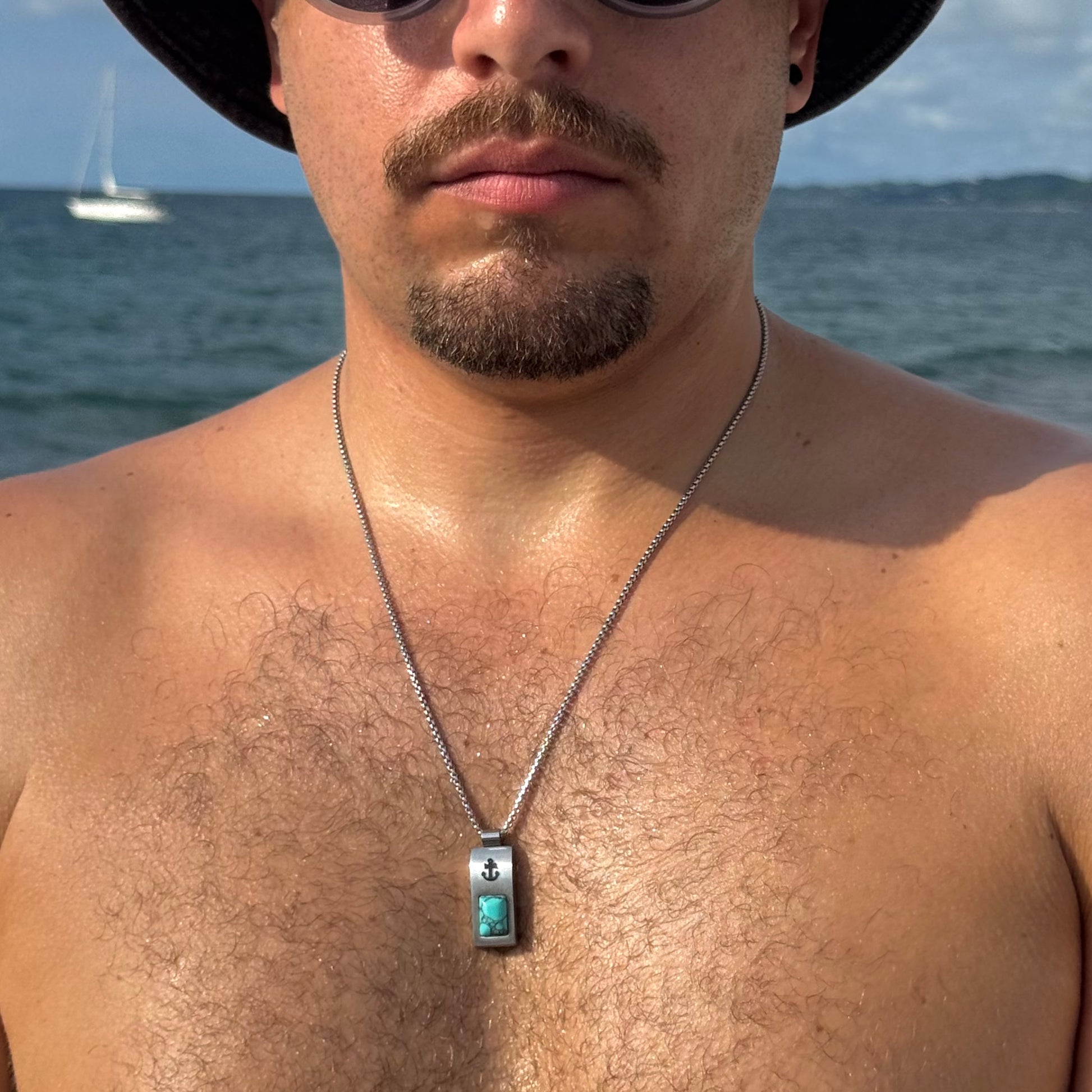 Una cadena que combina fuerza y estilo, elaborada en acero inoxidable con un dije de piedra turquesa natural que destaca por su color vibrante y significado protector. Un accesorio ideal para complementar cualquier look con un toque único.