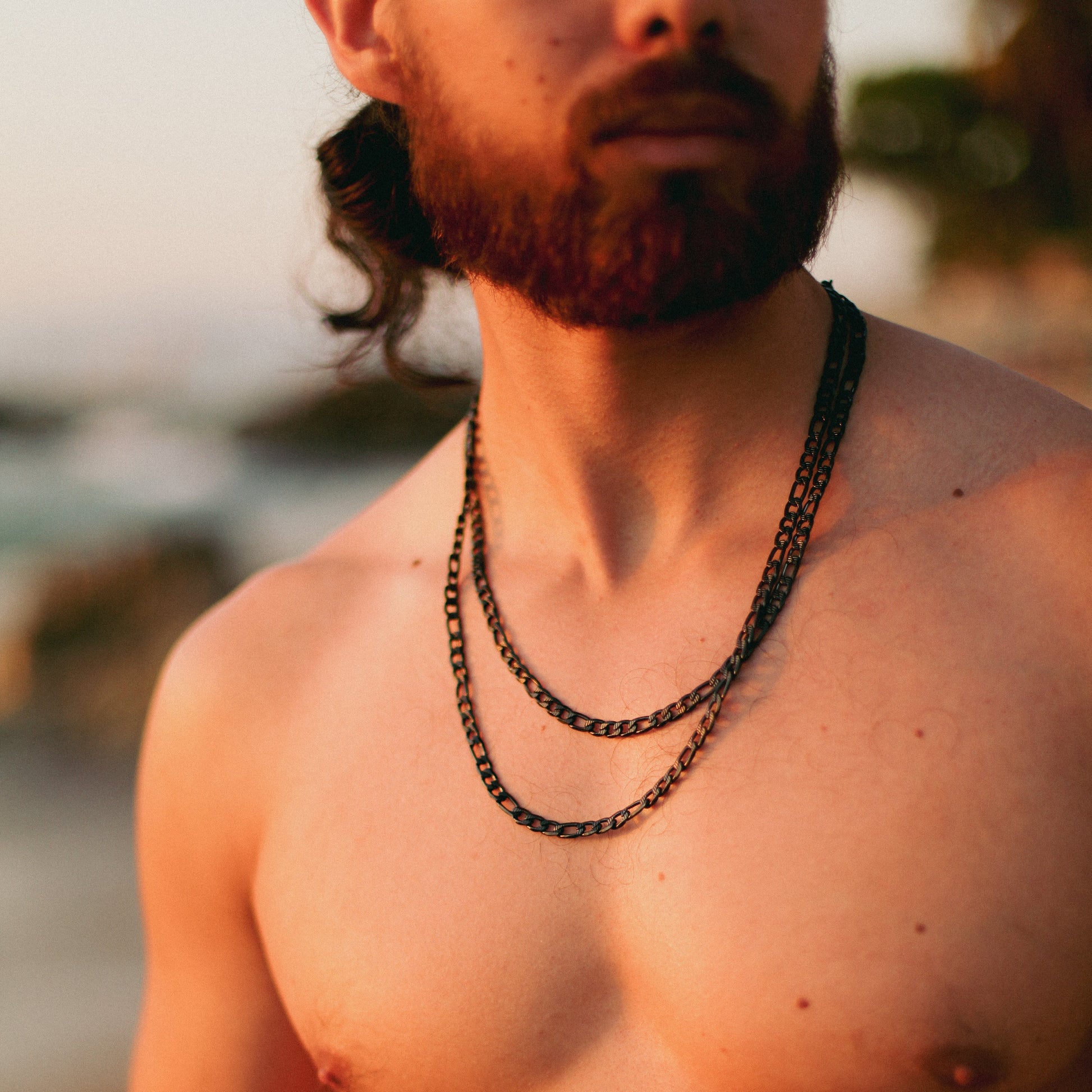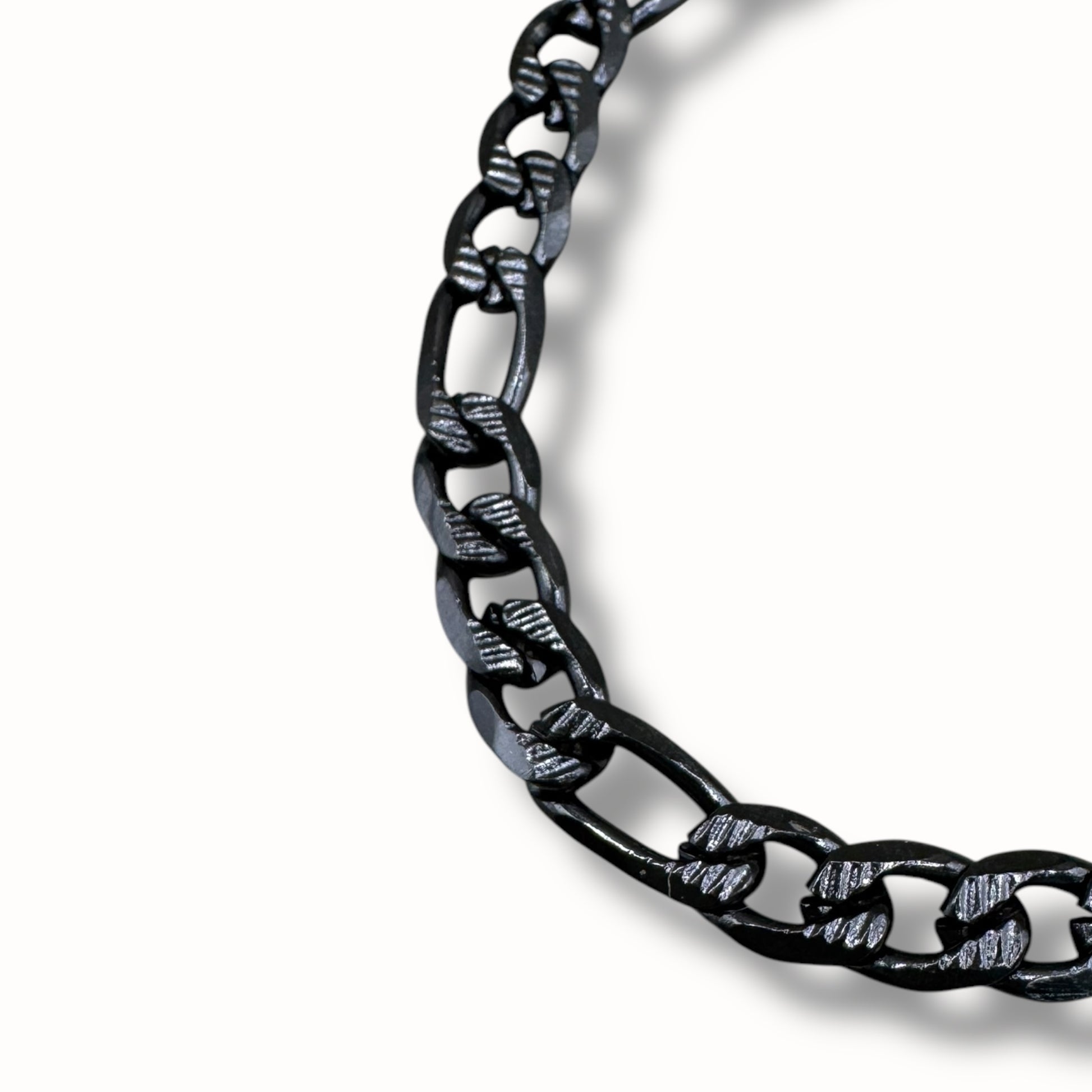 Esta cadena de caballero de diseño Figaro 3x1 ofrece un estilo moderno y elegante, con eslabones que combinan armónicamente tramos largos y cortos. Su acabado diamantado realza el brillo del acero negro, aportando un toque sofisticado y distintivo.