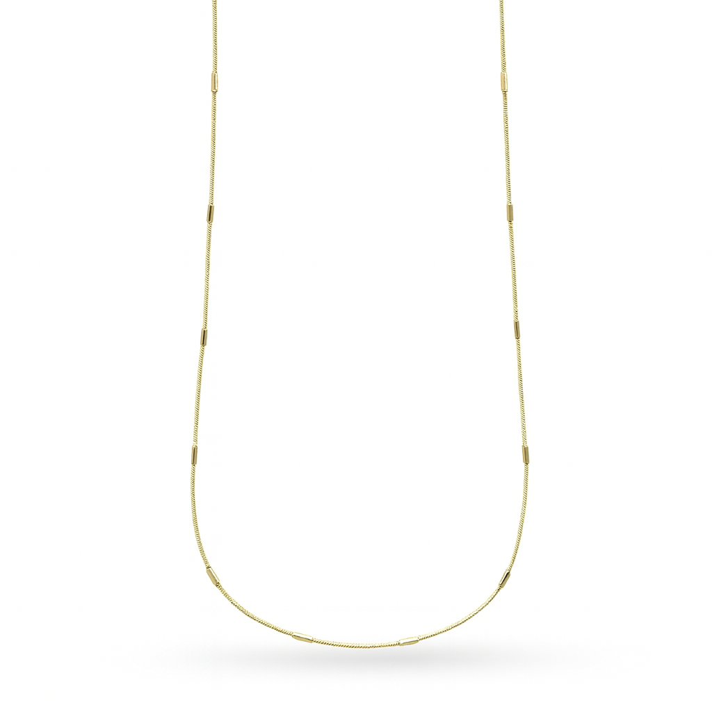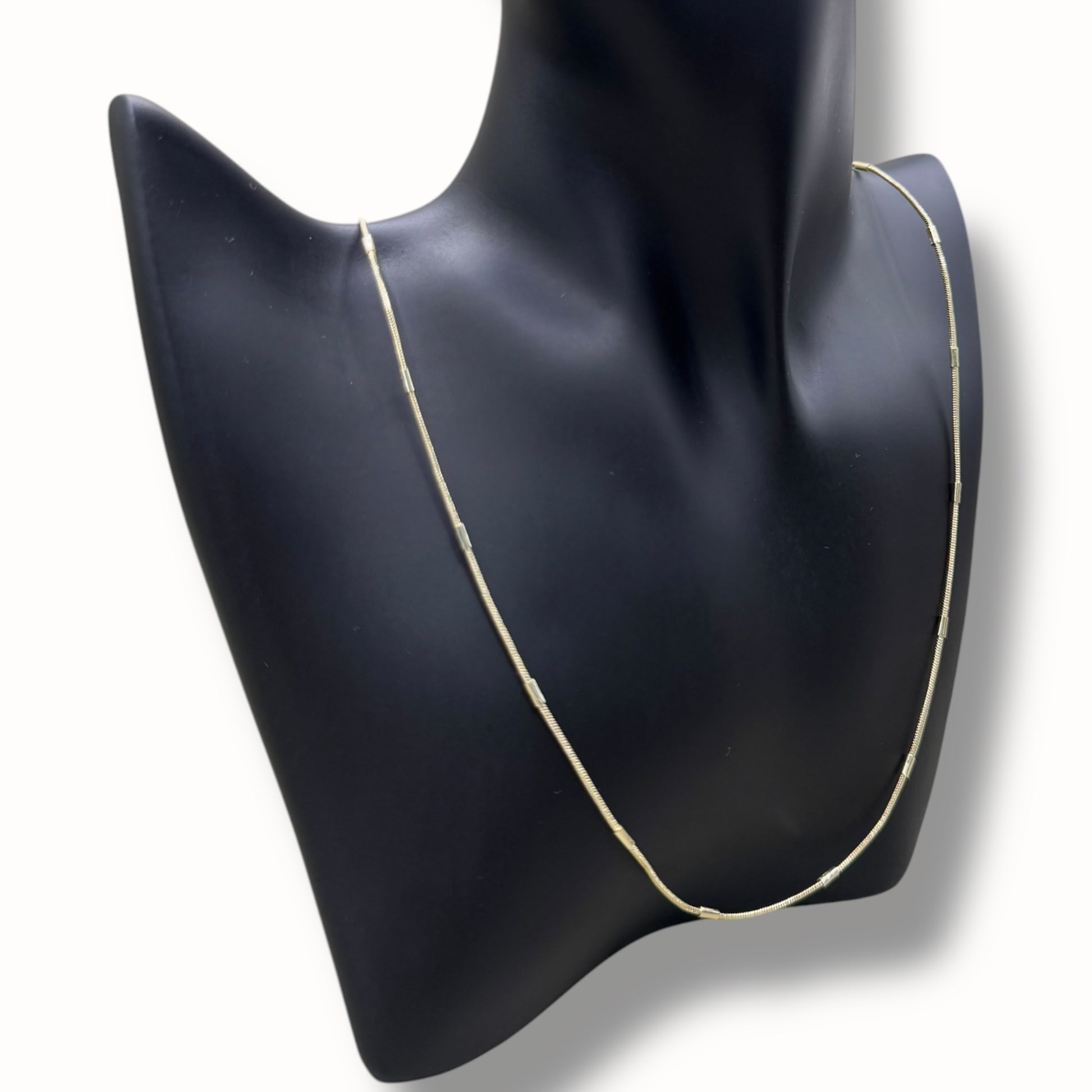 Cadena delgada con acabado tipo cola de rata, adornada con discretos segmentos lisos que aportan brillo y textura. Su diseño elegante y minimalista la convierte en una pieza versátil y refinada, ideal para uso diario o como base para dijes delicados.