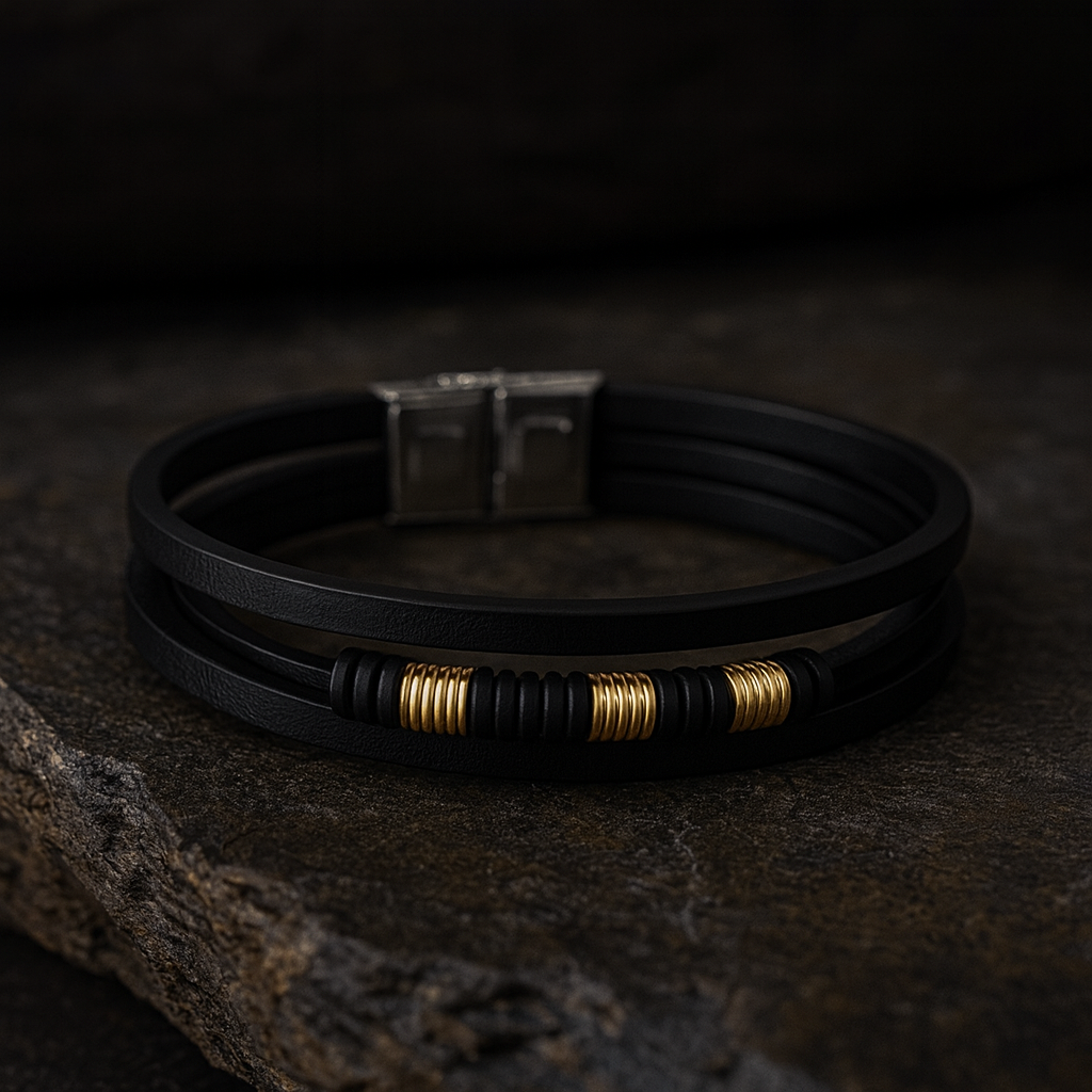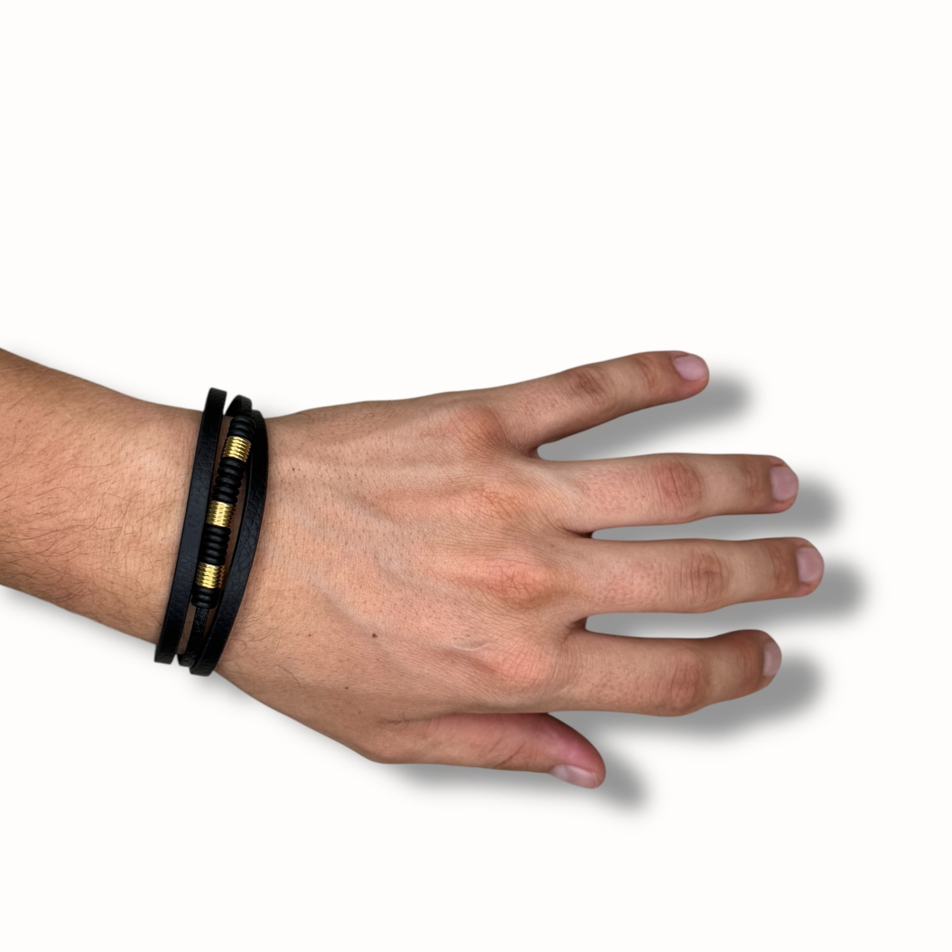Diseño moderno y sofisticado para el hombre que cuida cada detalle. Esta pulsera combina doble cuerda negra con elegantes arcos de acero dorado, creando un contraste perfecto entre fuerza y estilo.
