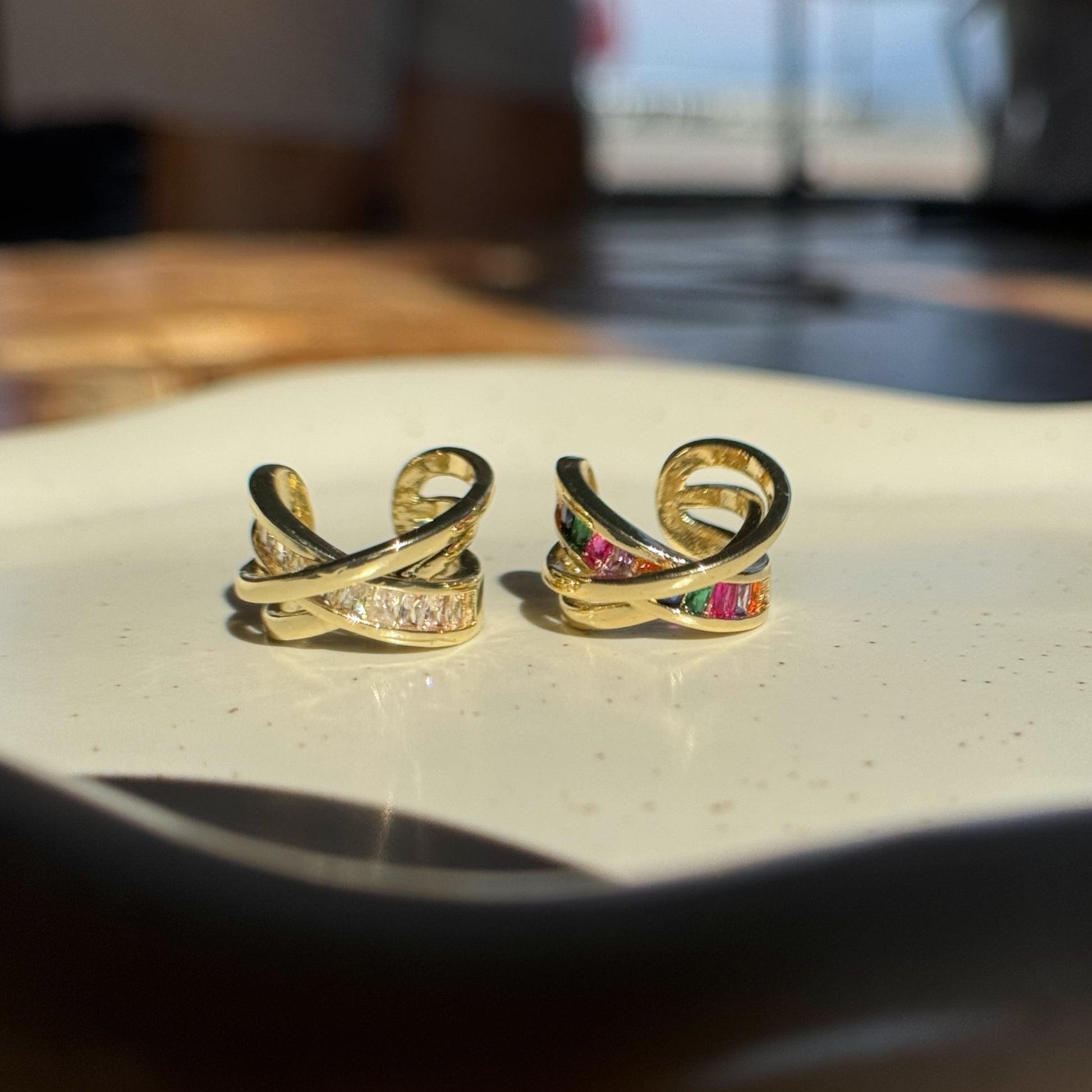 Diseño contemporáneo con doble banda cruzada que enmarca una línea de circonias blancas o multicolor. Hecho en oro laminado de 14k, esta pieza aporta un equilibrio perfecto entre brillo, color y sofisticación—sin necesidad de perforación.