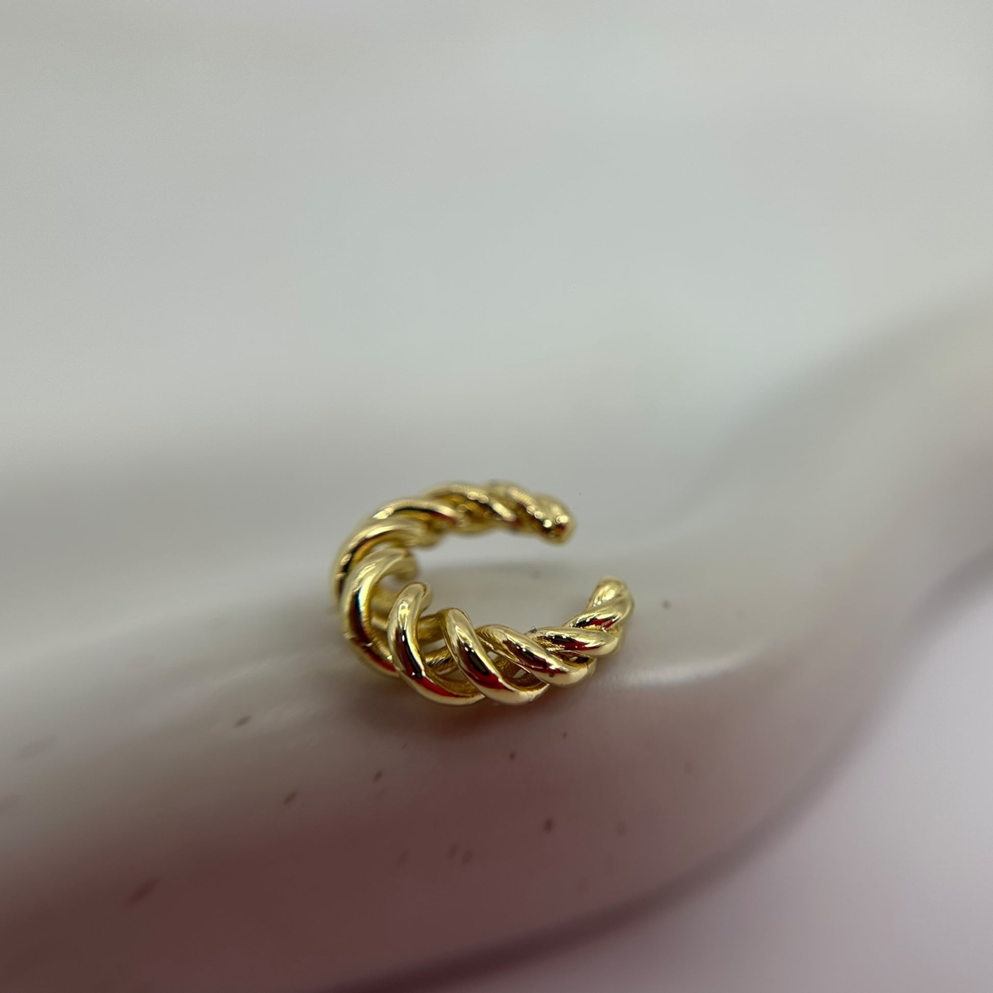 Diseño sin perforación con textura de cuerda torcida que aporta un estilo bold pero elegante. Su acabado dorado y forma envolvente lo hacen perfecto para sumar un toque moderno y sofisticado a tu look, sin necesidad de perforaciones.