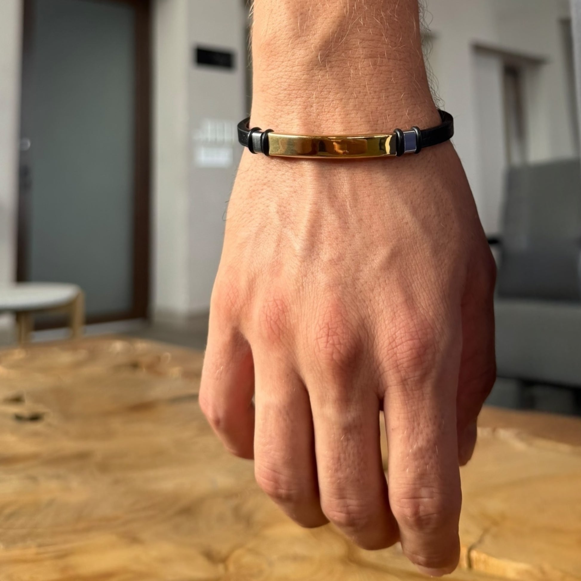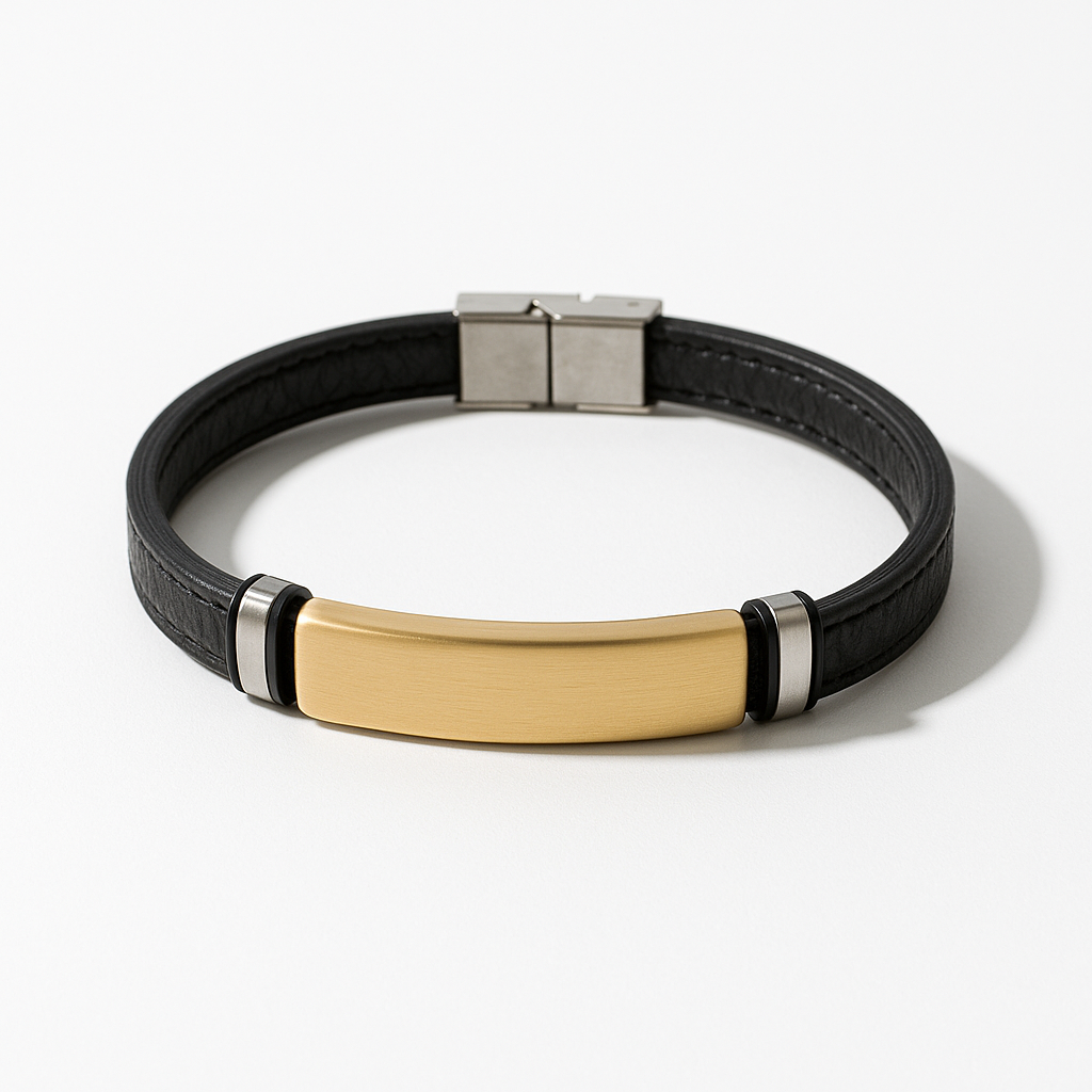 Diseño sofisticado que combina piel de alta calidad con una placa central en acero dorado. Un equilibrio perfecto entre elegancia y carácter.