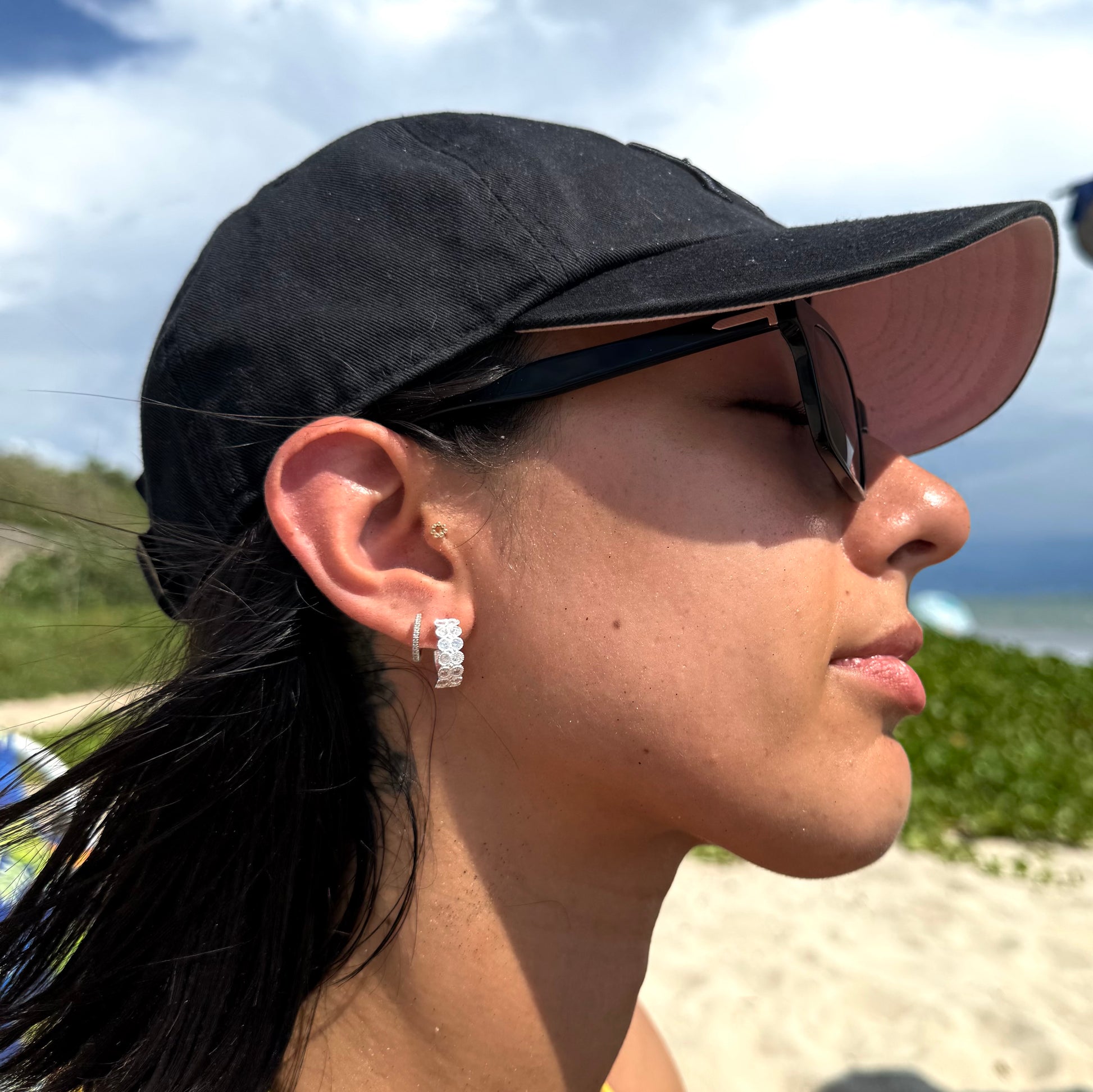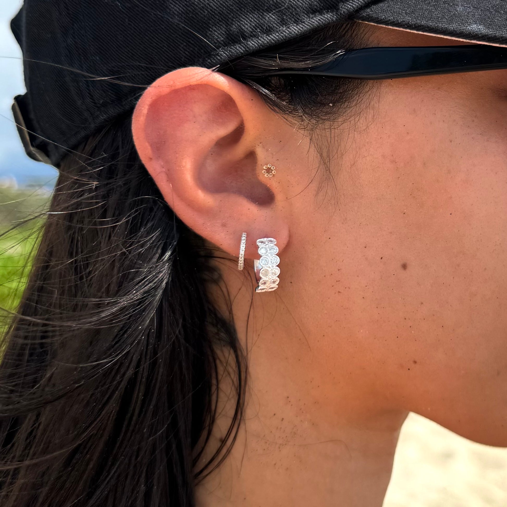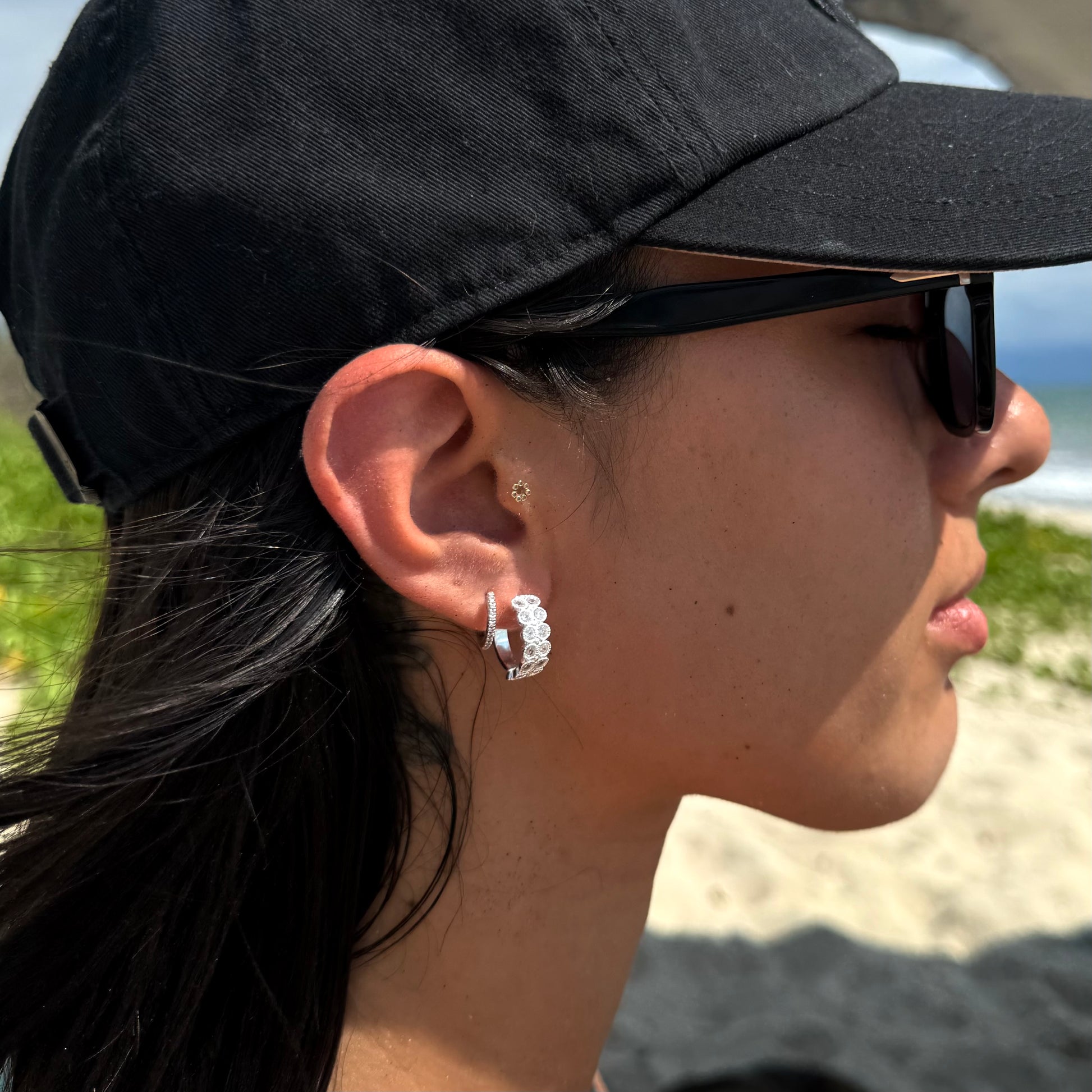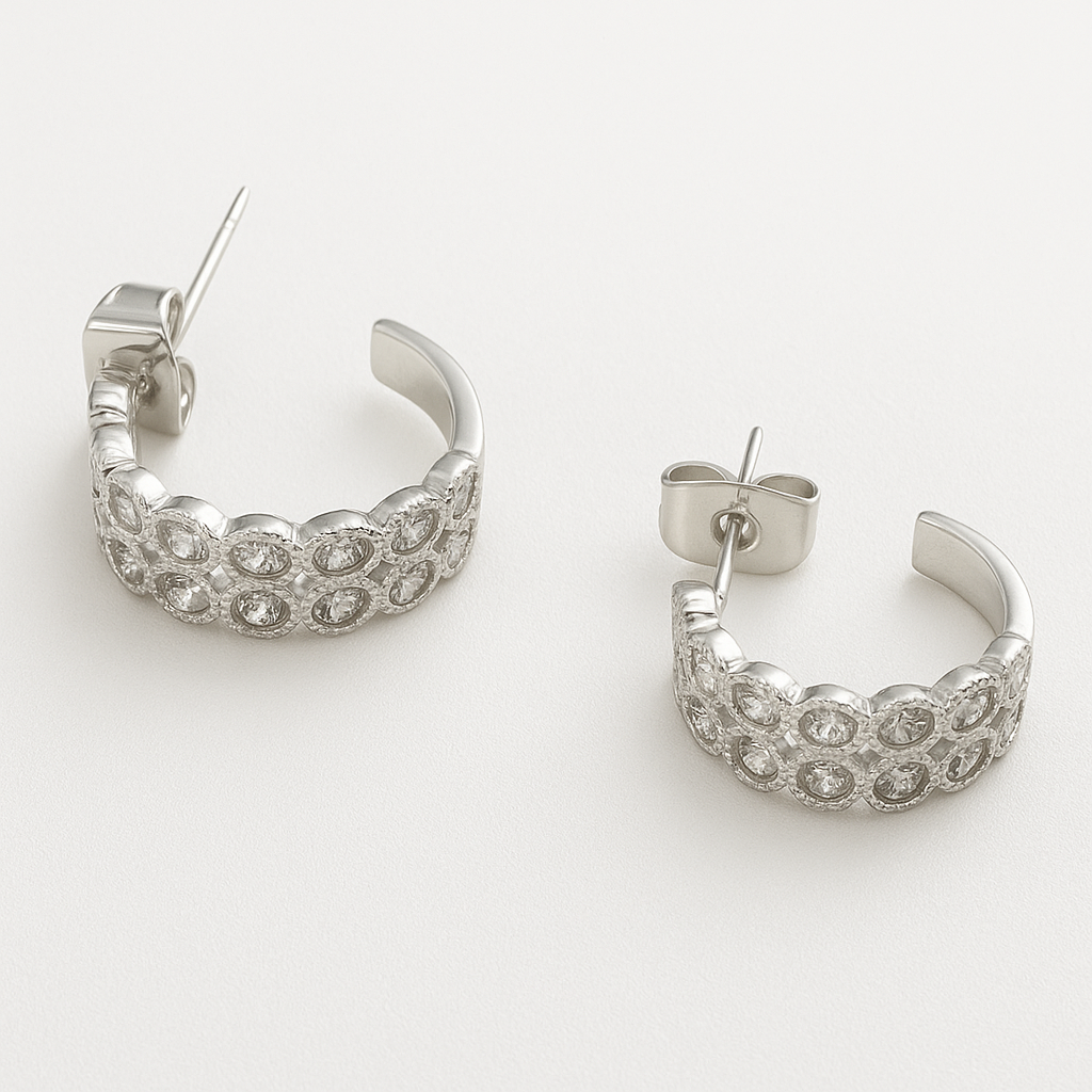 Estos aretes huggies dobles destacan por su elegante diseño con circonias brillantes, aportando un toque sofisticado y moderno. Perfectos para complementar cualquier look femenino, desde casual hasta elegante.