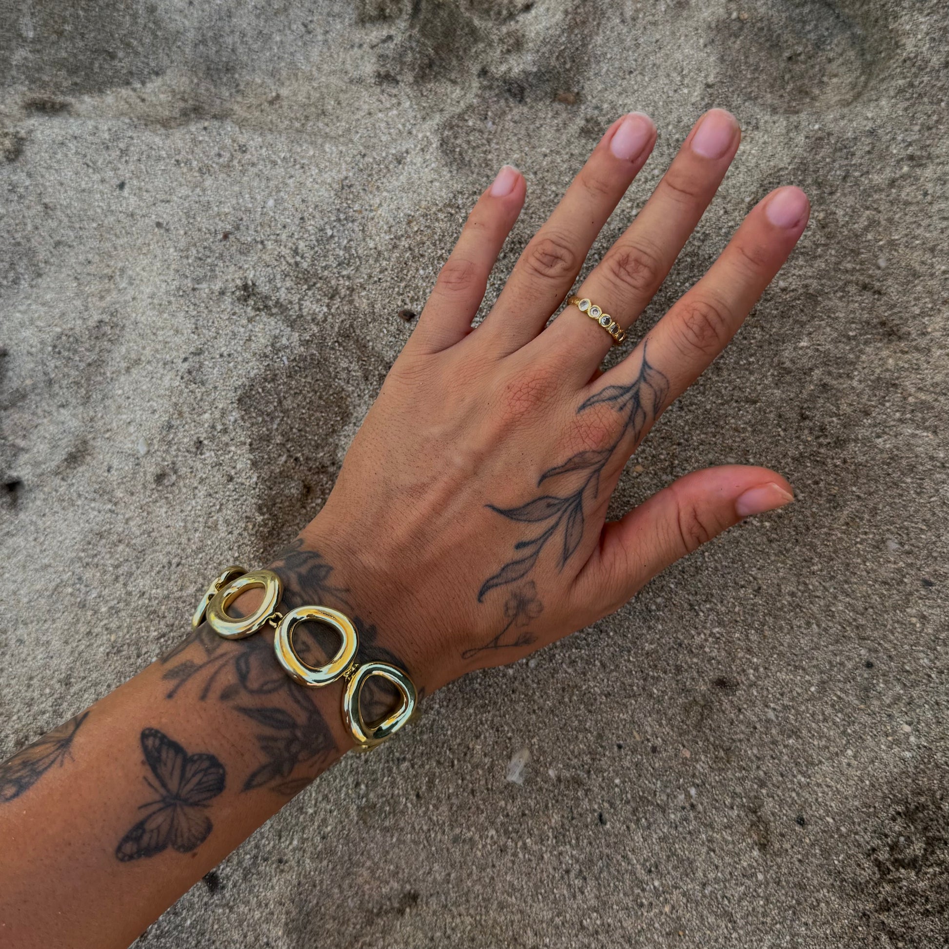 Esta pulsera resalta por su estilo moderno gracias a la repetición de aros entrelazados que crean un efecto elegante y dinámico. Su diseño atemporal la convierte en una pieza versátil que puedes combinar con cualquier look, desde lo casual hasta lo sofisticado.