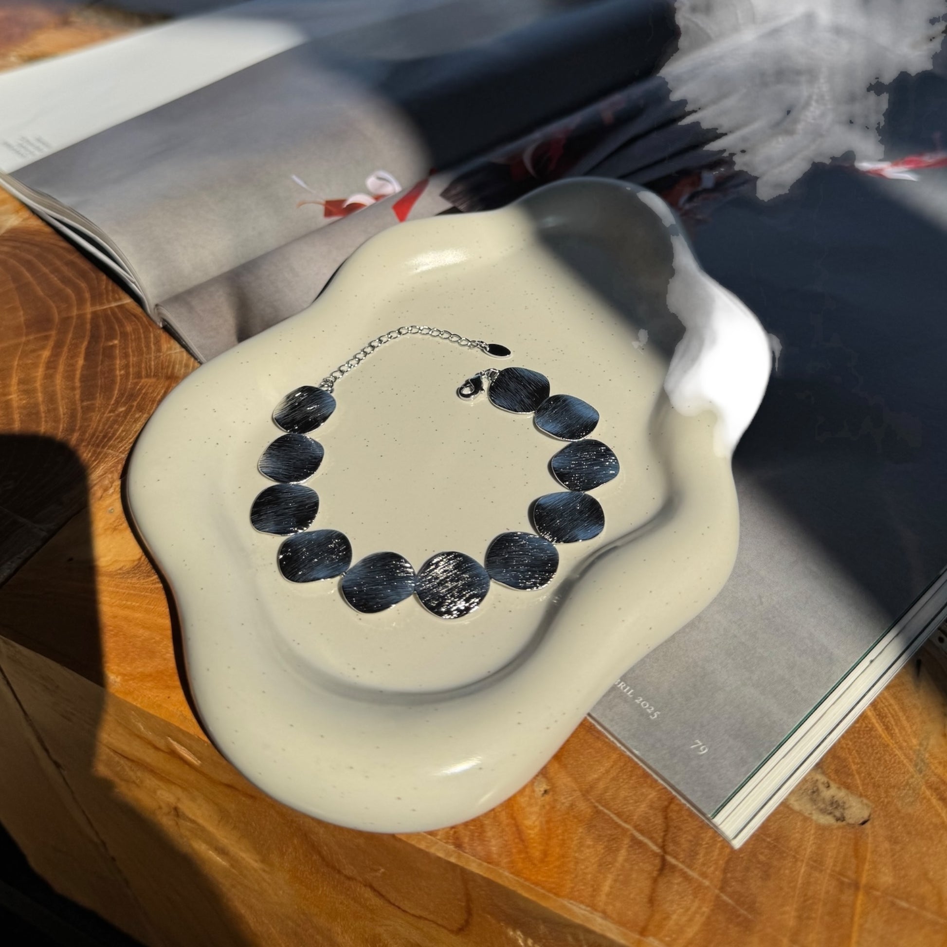 Pulsera ajustable con círculos metálicos texturizados que juegan con la luz en cada movimiento. Un diseño minimalista con mucha personalidad.