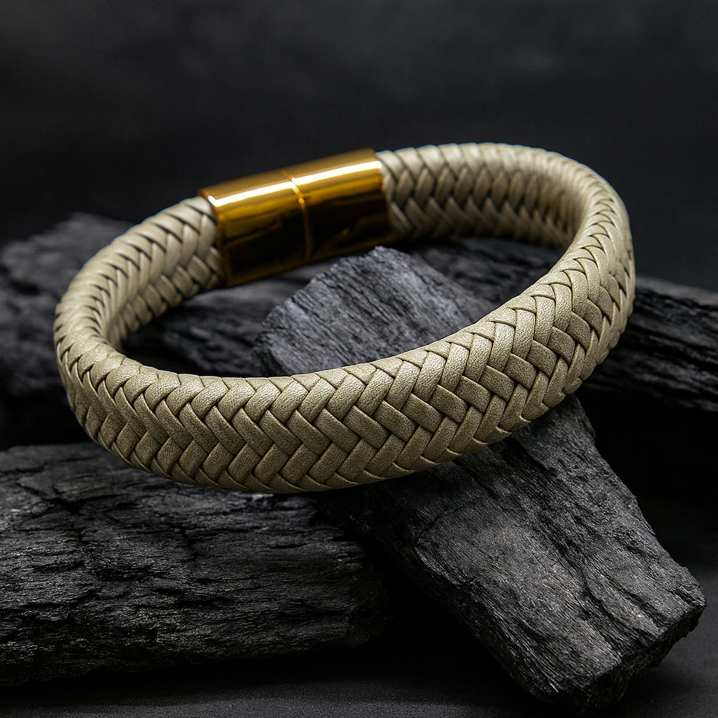 Esta pulsera combina piel entrelazada de alta calidad con un elegante broche dorado, ofreciendo un diseño moderno y sofisticado. Es el accesorio perfecto para resaltar tu estilo en cualquier ocasión, desde casual hasta formal.