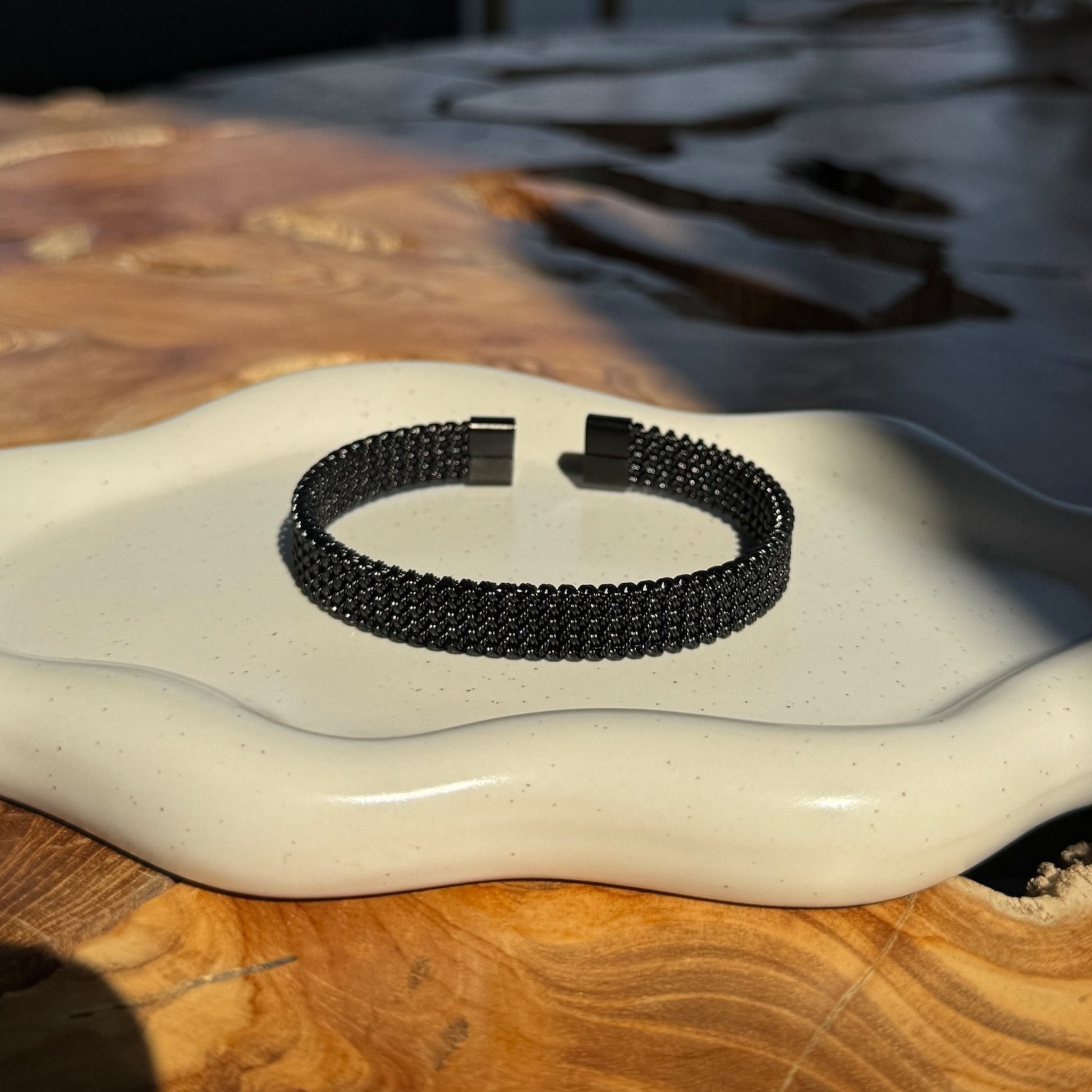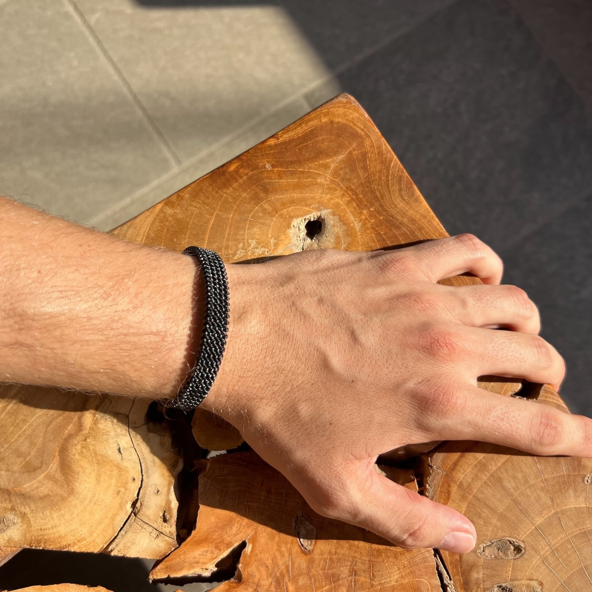 Diseño trenzado con carácter. Esta pulsera de doble cuerda negra combina textura y contraste con detalles en acero dorado, creando un look moderno y elegante.