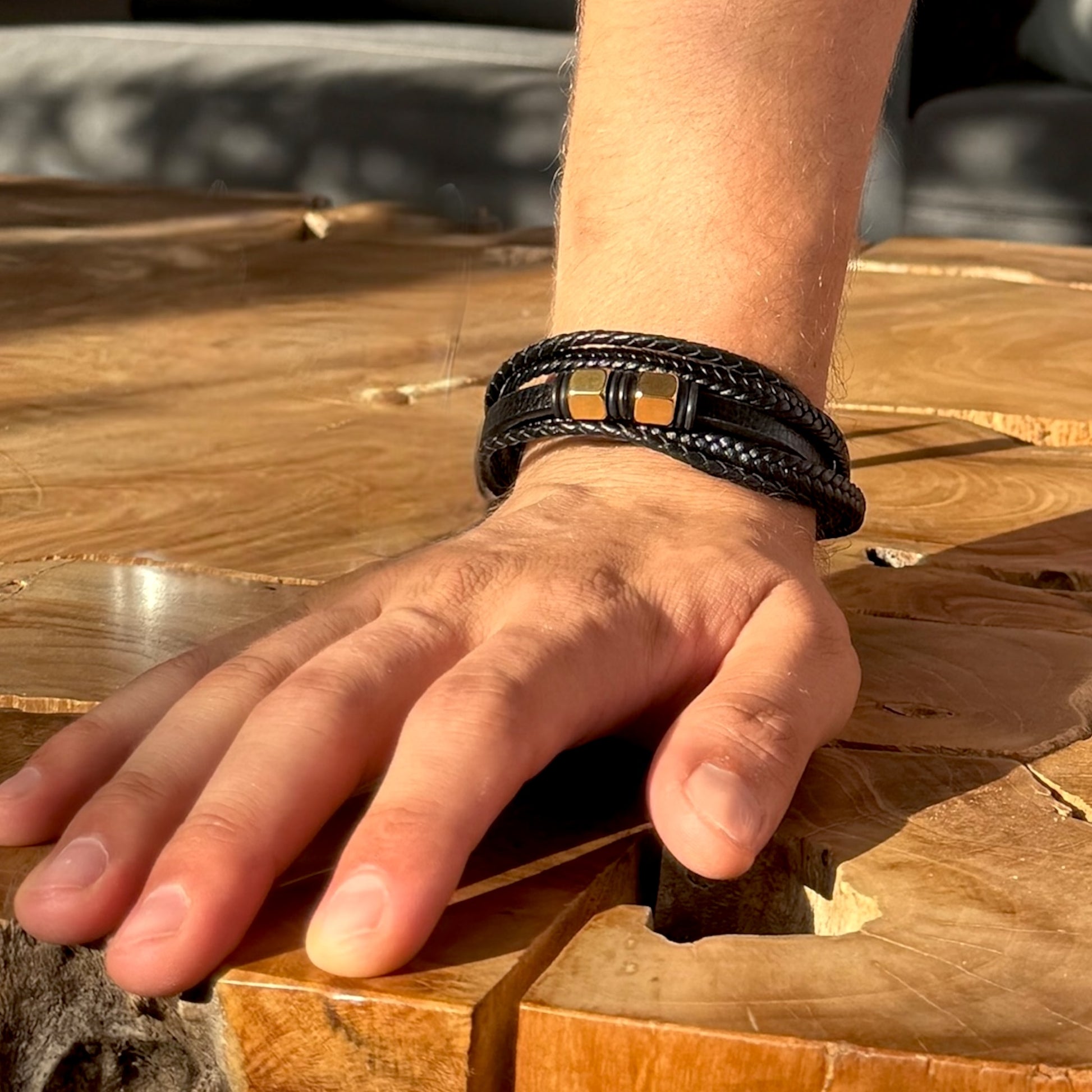 Diseño sofisticado y moderno con extensible de piel de alta calidad y elegantes placas en forma de tuercas de acero dorado o plata. Su sistema de cierre magnético brinda comodidad y seguridad. Ideal para un estilo distinguido y versátil.