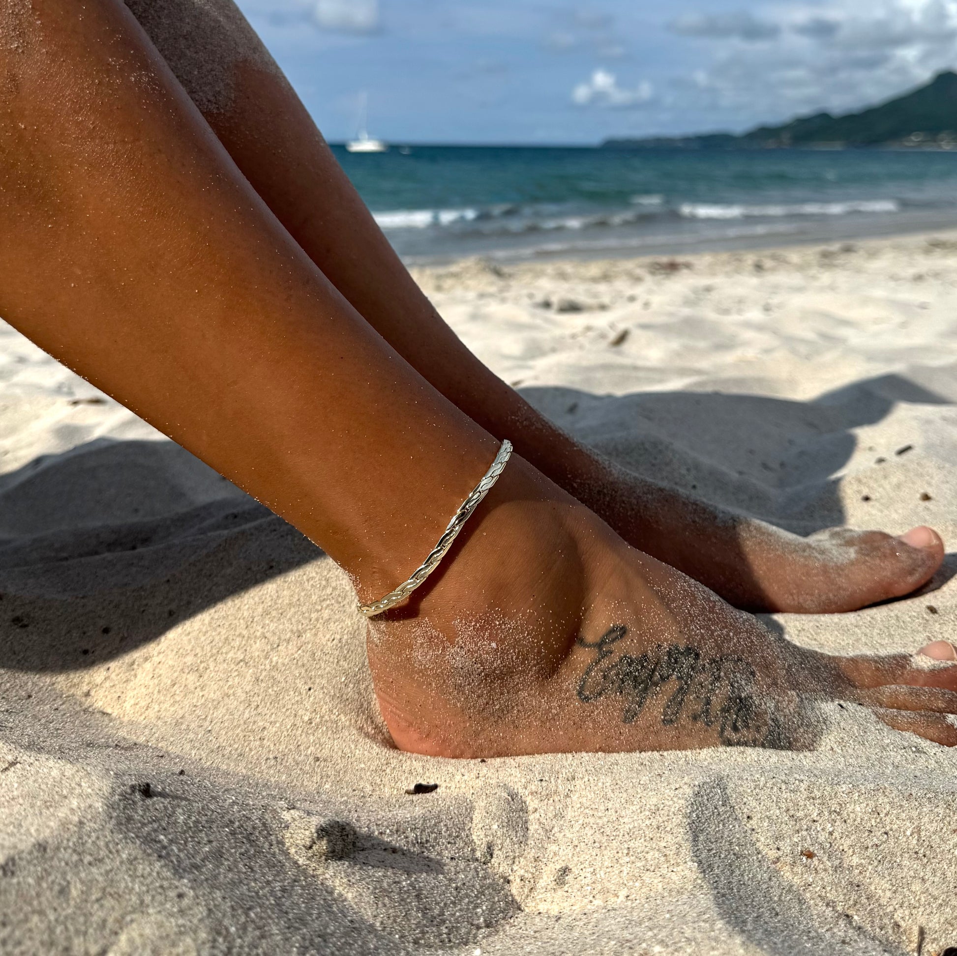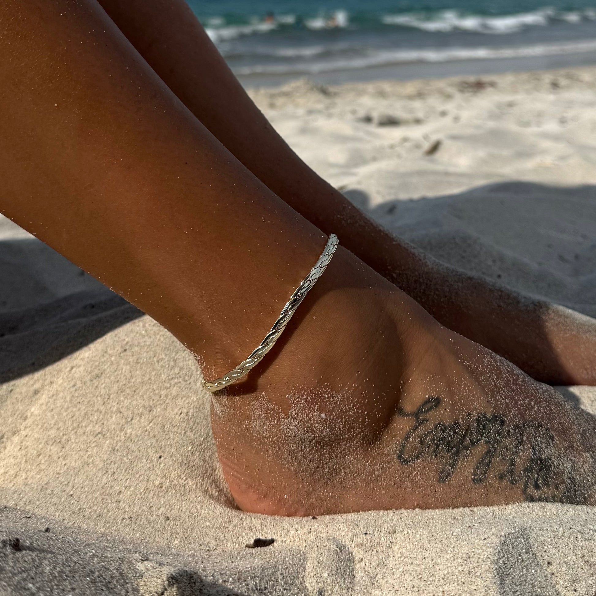 Esta tobillera de trenzado grueso aporta fuerza y estilo a cada paso. Su diseño entrelazado transmite un aire moderno y atrevido, convirtiéndose en el detalle perfecto para destacar tu look con personalidad.