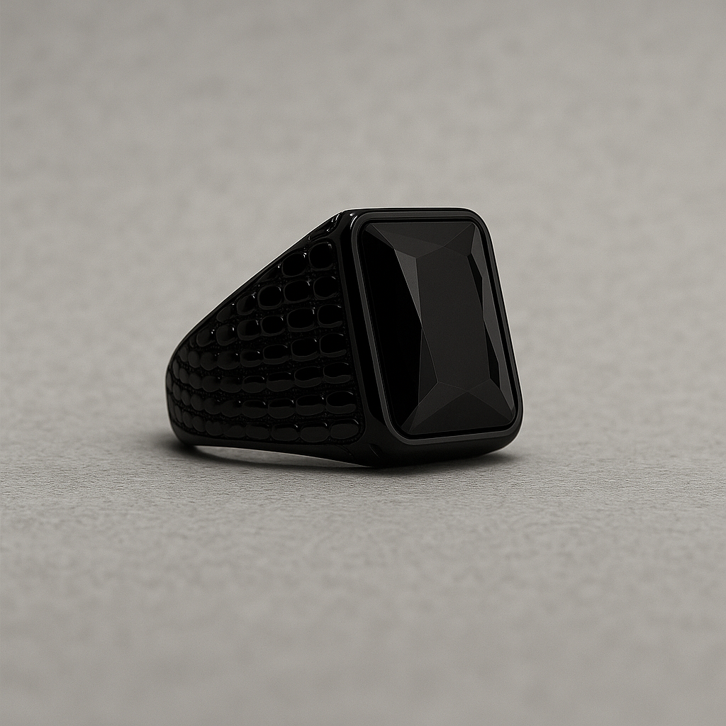 Diseño audaz con carácter salvaje. Este anillo completamente negro combina elegancia con un toque exótico gracias a sus costados texturizados que simulan piel de víbora. Una pieza distinta que transmite fuerza y estilo.